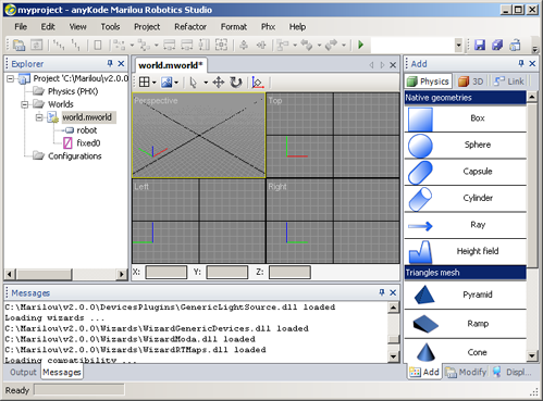 Une fois le fichier du monde choisi, Marilou affiche 4 vues graphiques qui vont servir à la modélisation. On notera au passage que le panneau "Add" contient désormais les géométries qui pourront être importées dans le monde. |
