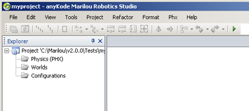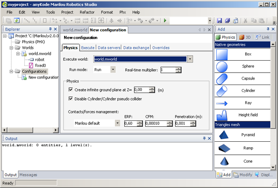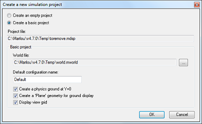 Dans la fenêtre New Project, choisir basic project puis OK. L'assistant génère une projet avec un monde (.mworld) et une configuration par défaut. |